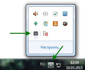 1. Откройте системный трей, нажав на значок находящийся в правом нижнем углу рабочего стола, рядом с часами. Далее кликните по иконке Dr.Web, левой кнопкой мыши.
