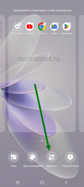2. В появившемся внизу меню, жмём на кнопку «Виджеты».