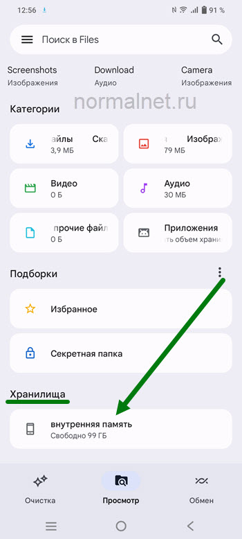 8. Внизу экрана жмём на пункт «Внутренняя память».