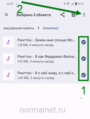 6. Выделяем аудиофайлы долгим нажатием, после жмём на кнопку меню, в правом верхнем углу.