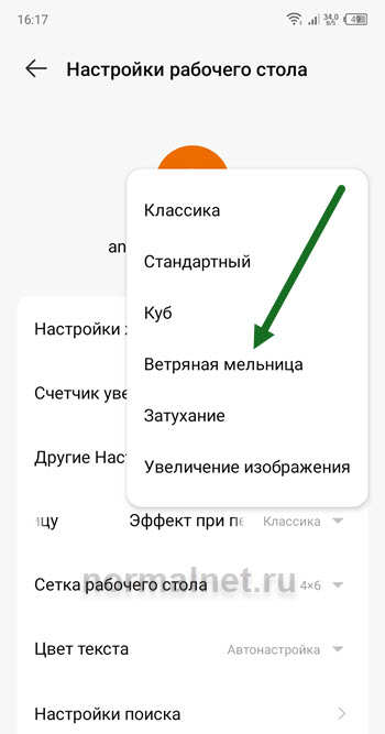 4. В открывшемся окне, выбираем один из вариантов: классика, стандарт, куб, ветряная мельница, затухание, увеличение изображения.
