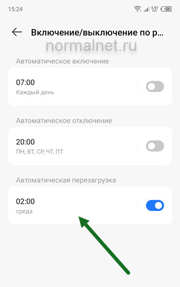 Поискав в настройках, мне удалось найти раздел, в котором можно активировать запланированное включение, выключение и перезагрузку устройства.