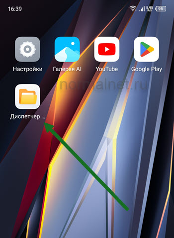 1. Запускаем системное приложение «Диспетчер файлов», по умолчанию предустановлен, на всех устройствах.