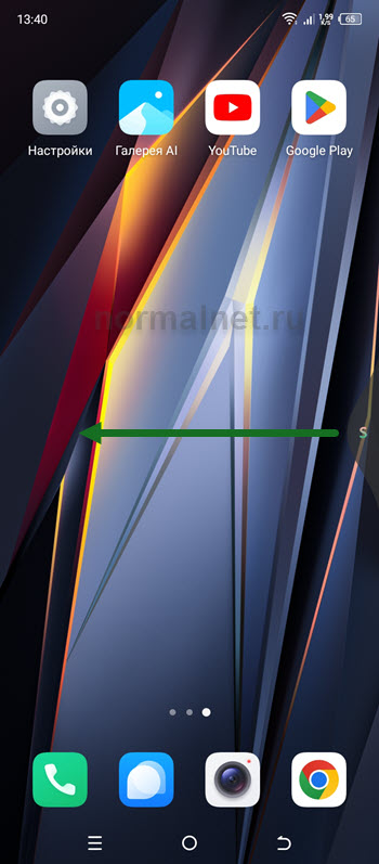 Касаемся правой части дисплея, далее проводим по экрану в право и удерживаем некоторое время, две — три секунды.
