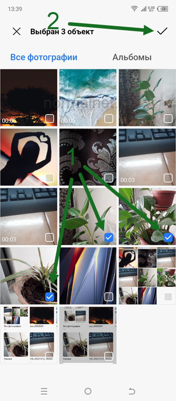 5. Выделяем изображения которые нужно добавить, после жмём на галочку, в правом верхнем углу.