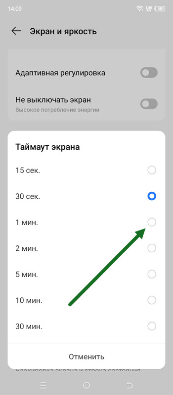 4. Устанавливаем необходимое время, имеются варианты 15 — 30 секунд, 1, 5, 10, 30 минут.