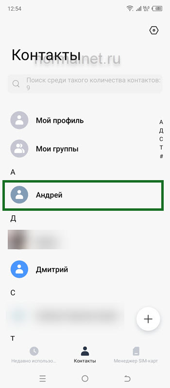 2. Далее переходим в раздел «Контакты», нажав на соответствующую кнопку в низу экрана.