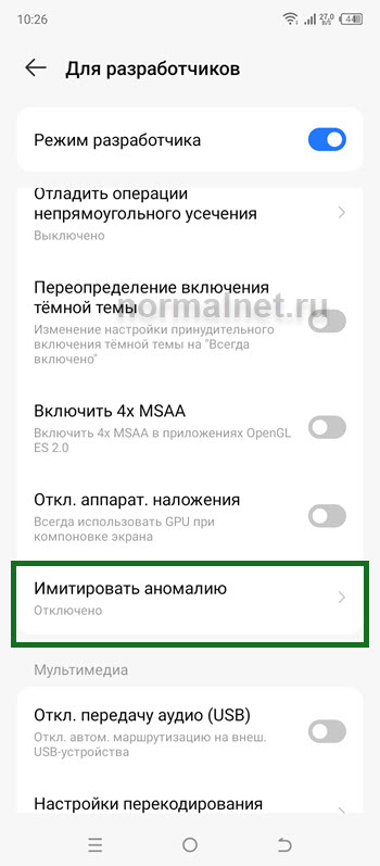 2. Среди многочисленных пунктов, находим «Имитировать аномалию», и жмём на него.