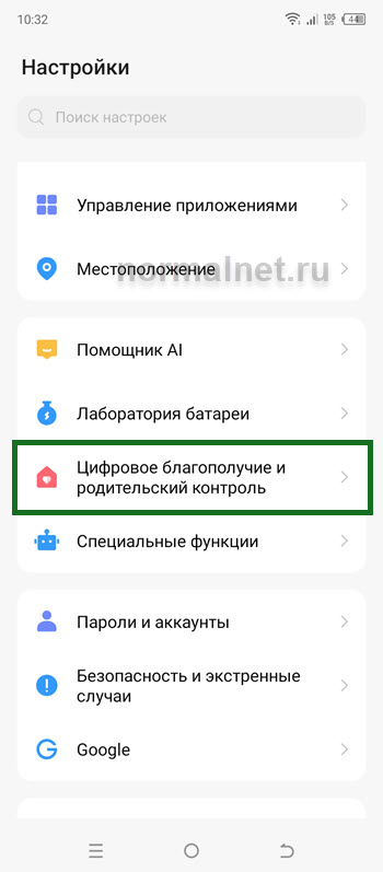 2. Далее переходим в раздел «Цифровое благополучие и родительский контроль».