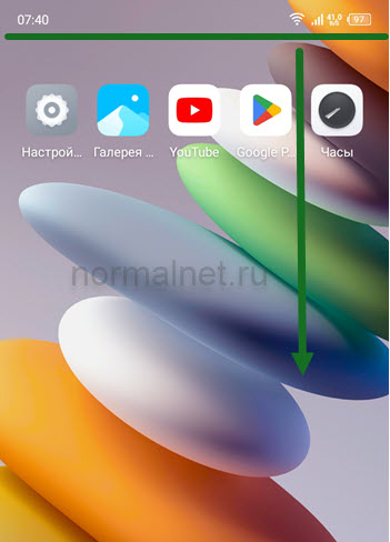 1. Опускаем шторку уведомлений, движением пальца в низ, в правой части экрана.
