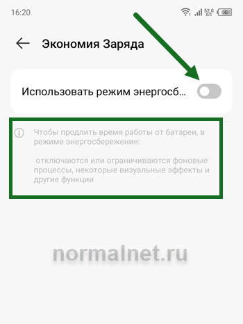 При еко активации, отключаются или ограничиваются фоновые процессы, некоторые визуальные эффекты и другие функции.