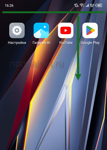 1. Опускаем шторку движением пальца вниз, от верхней правой части экрана.