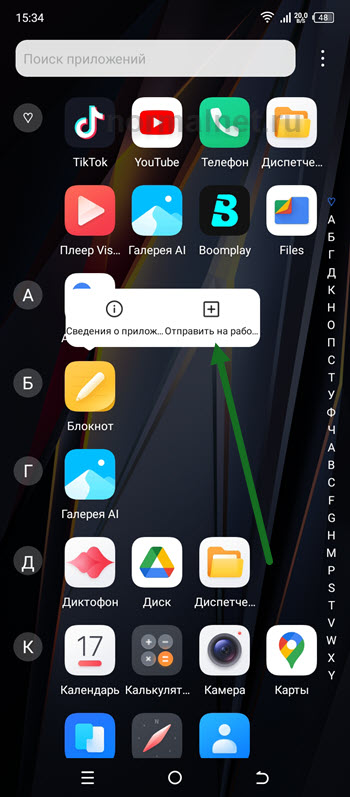 2. Находим нужный значок, нажимаем на него и удерживаем некоторое время, одну — две секунды.