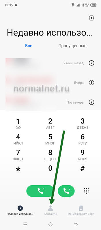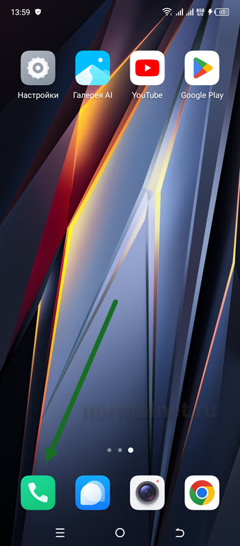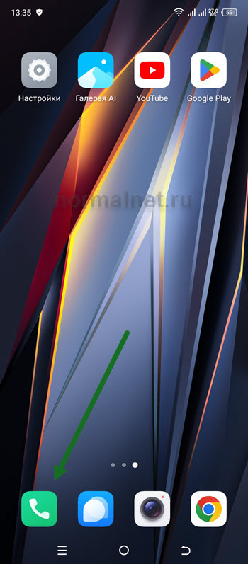 1. Открываем приложение телефон, нажав на зелёную трубку.