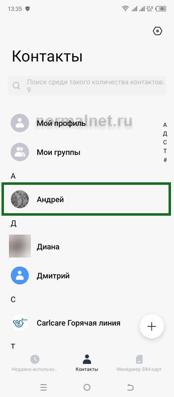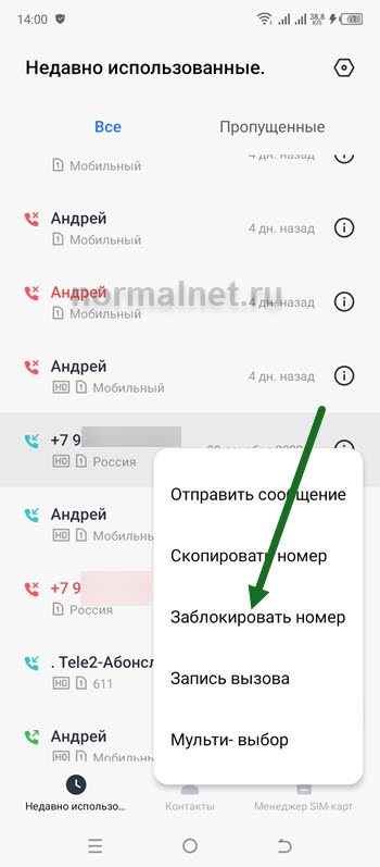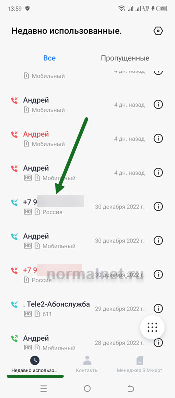 2. В журнале вызовов, находим нужный номер, нажимаем на него и удерживаем некоторое время, одну — две секунды.