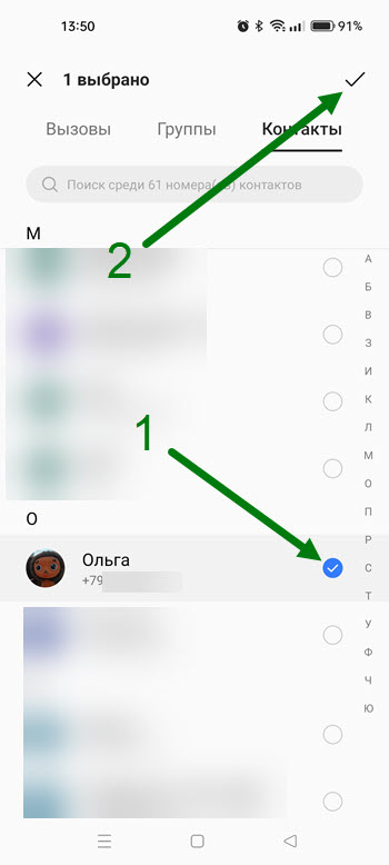 5. Выделяем нужных абонентов, после жмём на галочку в правом верхнем углу.