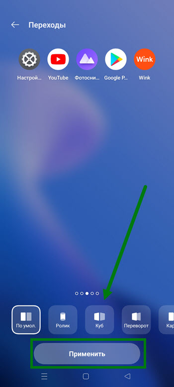 4. Выбираем понравившийся переход, после жмём на кнопку «Применить», после чего нововведения вступят в силу.