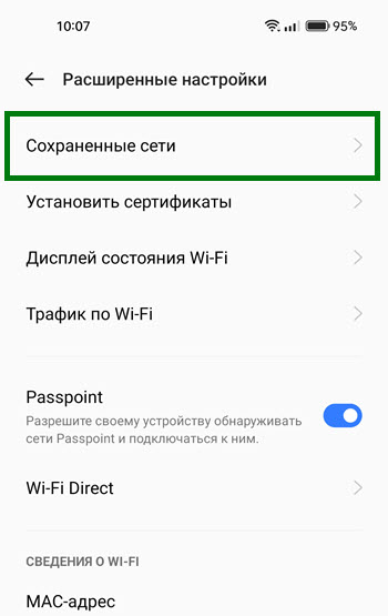 5. На открывшейся странице, нас интересует самый верхний пункт «Сохранённые сети».