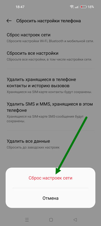 Обратите внимание, что обнулятся данные всех беспроводных сетей: Wi-Fi, Bluetooth и мобильные сети.
