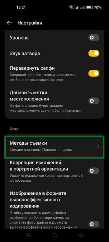 3. В открывшихся настройках, находим пункт «Методы съёмки» и жмём на него.