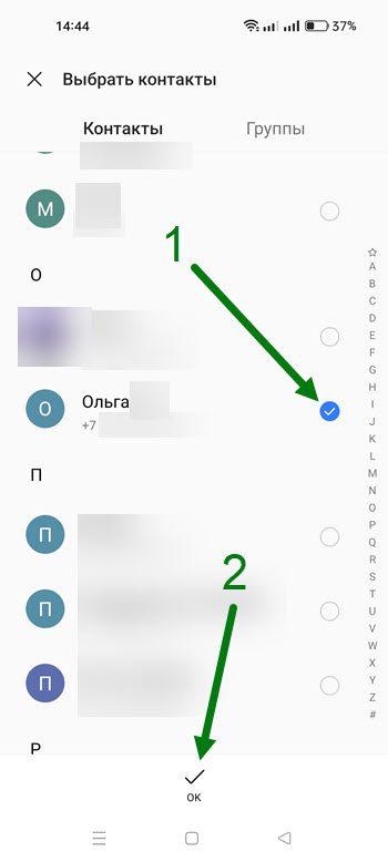 4. Находим нужный контакт, выделяем его галочкой, после жмём на кнопку «ОК».