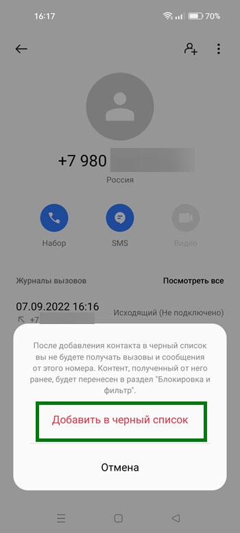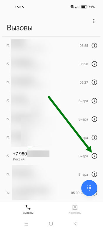 2. В журнале вызовов, находим нужный и жмём на кнопку «Восклицательный знак» напротив него.