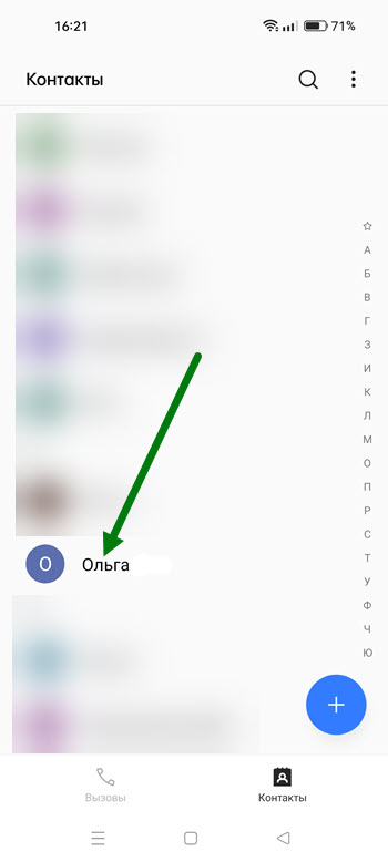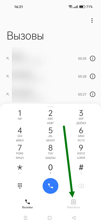 2. Далее переходим в раздел «Контакты», нажав на соответствующую кнопку, в правом нижнем углу.