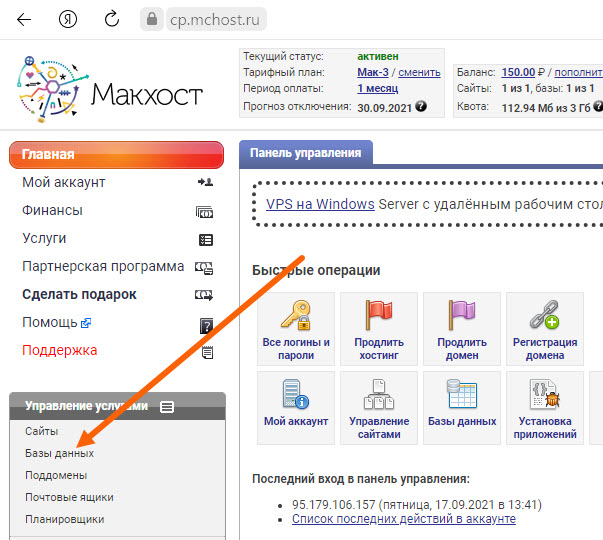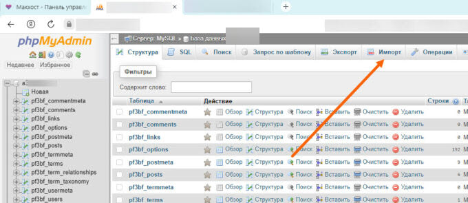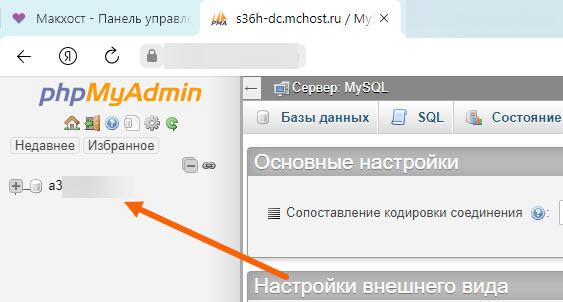 3. Кликаем по нашей базе, она находится в колонке слева.