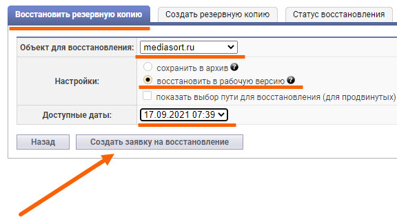 Процесс восстановления из резервных копий сгенерированных хостингом