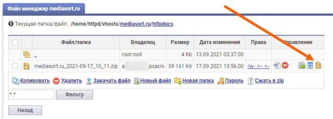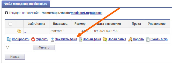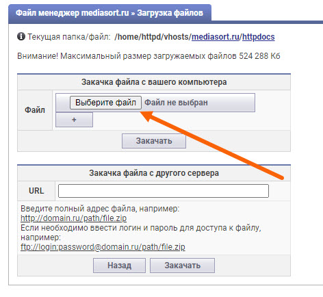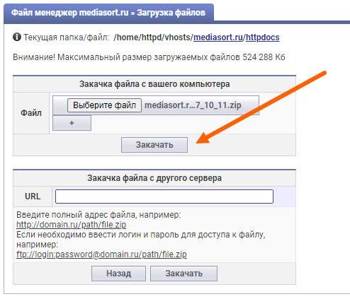 4. Теперь сюда нужно поместить архив с резервной копией сайта, жмём на кнопку «Закачать файл».