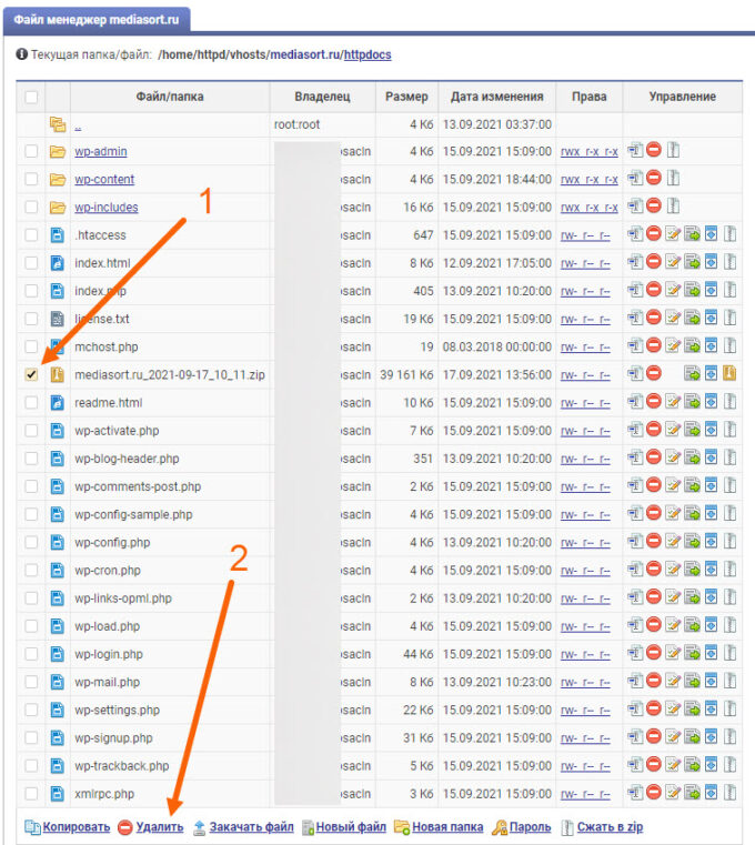 3. Автоматически открылась корневая папка, её необходимо полностью очистить, для этого выделяем все файлы, после жмём на кнопку «Удалить».